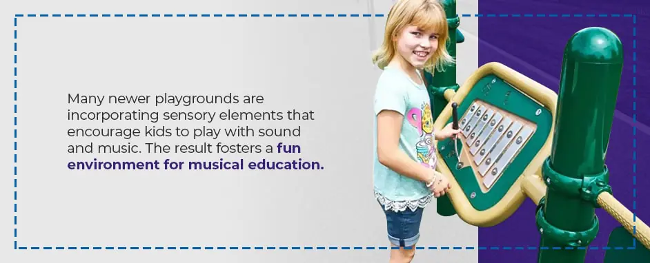 Many newer playgrounds are incorporating sensory elements that encourage kids to play with sound and music. The result fosters a fun environment for musical education. And musical education isn’t just about teaching kids to sing and play an instrument. It’s an essential sensory experience with wide-reaching impacts.