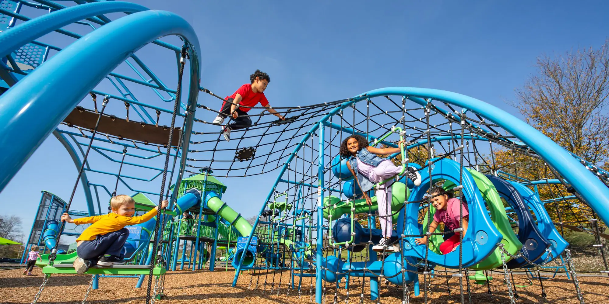 Children climbing through Phyzics Full Moon playground structure.