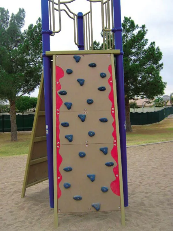 This 8’ (2,4m) climbing wall combines classic foot hand handholds with a climbing pole for a versatile play experience. Three walls converge to a deck at the top, which can be then used as a social hangout or as a path to climb down another wall. A Vertical Ladder option is also available.