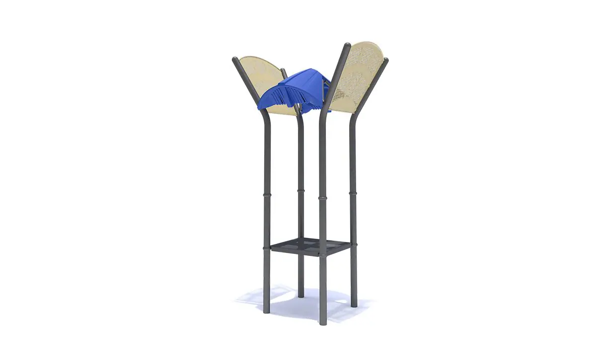 A waved roof rests between two angled Cheer Roofs for a bold combination that delights and shades visitors. Colors may be chosen separately for each component.