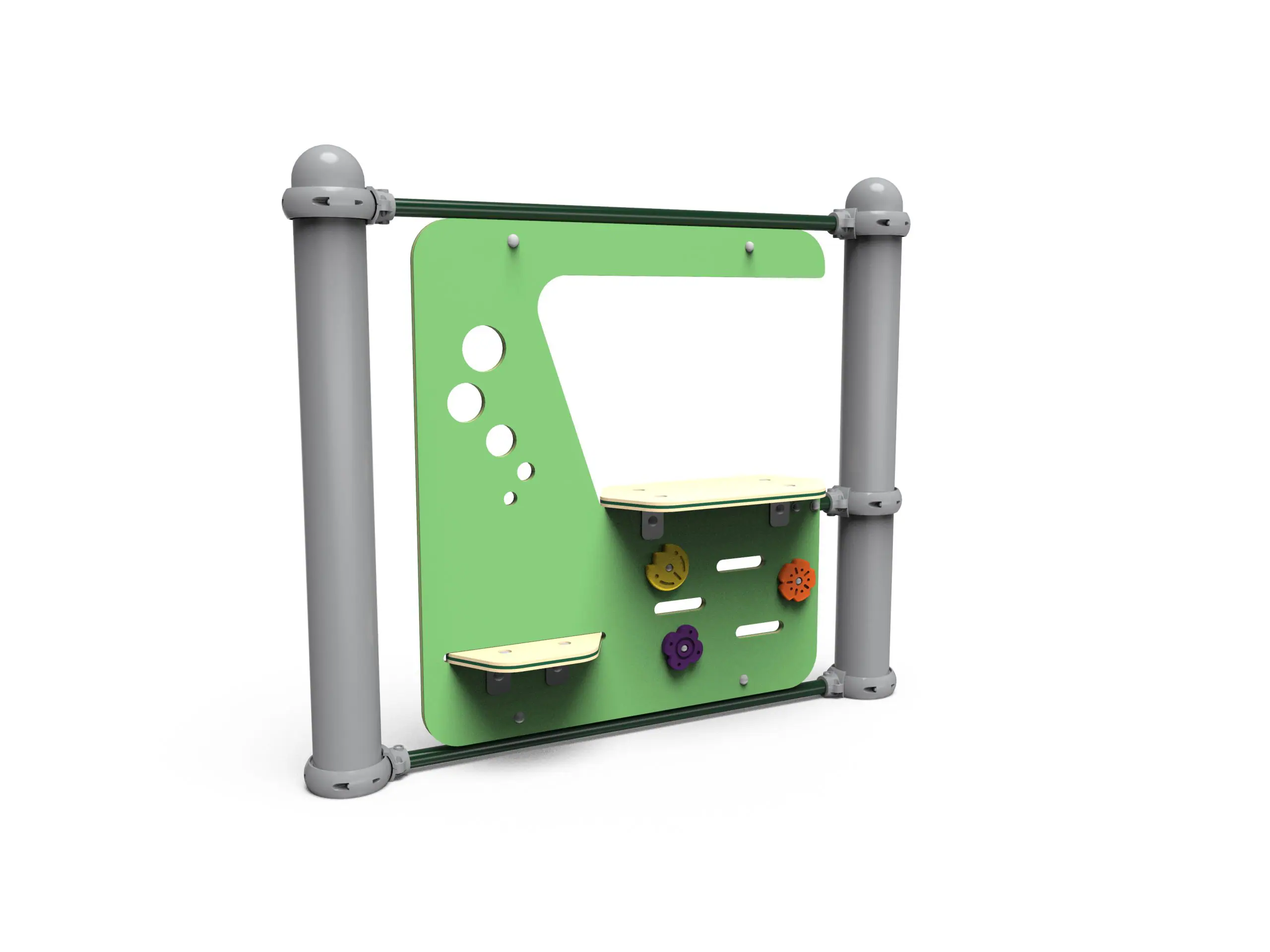Flower Stand Panel opens up a variety of innovative play scenarios. Children can push petals to customers at the counter, build their fine motor skills by twisting flower spinners, or stop and smell the roses as they rest on either the front or back seat. By taking inspiration from real-world examples, kids can enact a myriad of imaginative scenarios to improve upon their creativity and critical thinking. Peek-a-boo openings offer further opportunities for social play, as well as add to the cohesive aesthetic of this floral play panel.