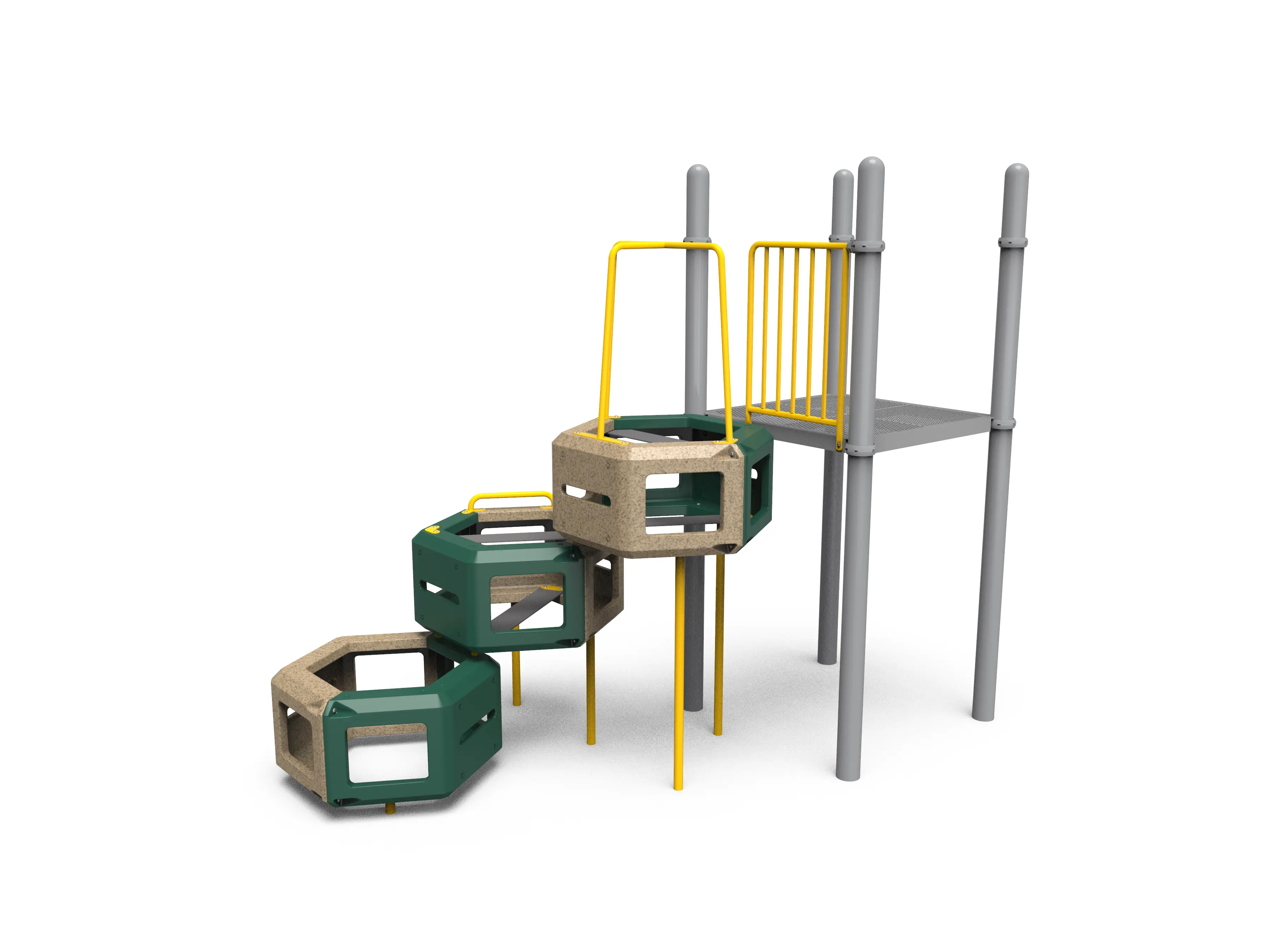 Featuring impressive height, this design inspires anyone looking for their next climbing challenge. Steel and flextread rungs create connections around and between the hexes that push kids to develop their skills as they explore.