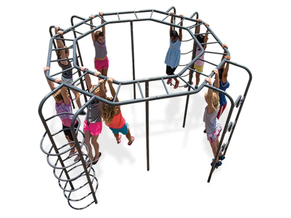 Kids will be crawling like tarantulas all over this thrilling climber! An octagonal overhead ladder offers round after round of fun, while four of the sides feature unique ladders to help kids reach it. Each ladder has a different set of rungs: curved, dual-sided curved, straight, and zigzag. With these options, kids can enjoy socializing and exercising with this exciting structure.